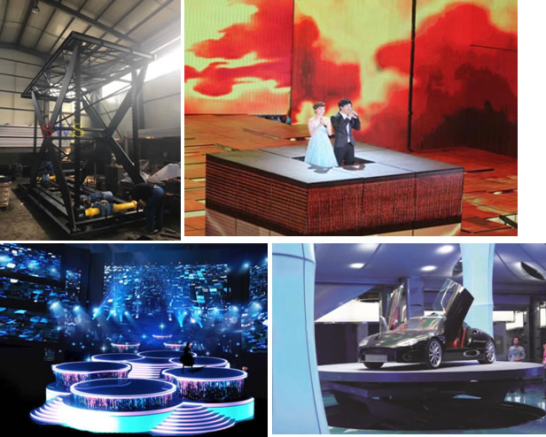 舞臺(tái)主要用于各種娛樂(lè)場(chǎng)所,歌廳舞廳,迪廳,賓館酒店、汽車展廳汽車展示旋轉(zhuǎn)展臺(tái)等場(chǎng)所,主要功能是用于場(chǎng)面轉(zhuǎn)換時(shí),上下移動(dòng)布景和演員。另外,為了突出主要演員,舞臺(tái)會(huì)徐徐升起,演員在舞臺(tái)上翩翩起舞,在舞臺(tái)上制造出高低起伏或旋轉(zhuǎn)的畫面,